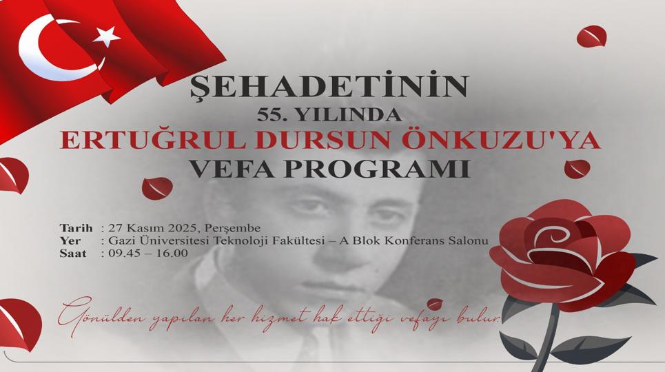 Gazi Üniversitesi Teknoloji Fakültesi, Teknik Eğitim Vakfı, Türk Eğitim-Sen ve Önkuzu Akademi iş birliğiyle, Ertuğrul Dursun Önkuzu’nun şehadetinin 55. yılında kapsamlı bir vefa programı düzenliyor. Panel, hatıralar, dua ve genç mühendislere başarı ödülleri töreniyle dolu program 27 Kasım 2025’te gerçekleştirilecek.