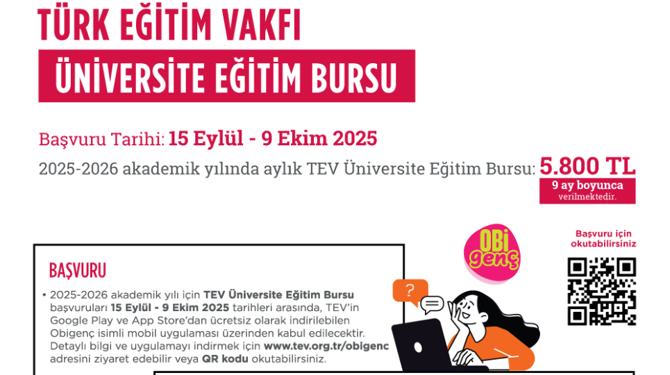 TEV Üniversite Eğitim Bursu başvuruları, 15 Eylül – 9 Ekim 2025 tarihleri arasında kabul edilecek. Başvurular, TEV’in Google Play ve App Store üzerinden ücretsiz indirilebilen “Obigenc” mobil uygulaması aracılığıyla yapılacak. Detaylı bilgiye ulaşmak ve uygulamayı indirmek için: www.tev.org.tr/obigenc.