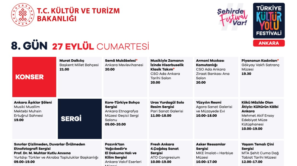 Türkiye Kültür Yolu Festivali, sekizinci gününde de Ankara’yı kültür ve sanatın merkezi haline getirdi. 27 Eylül Cumartesi günü Başkent’in dört bir yanında konser, tiyatro, sergi, atölye ve özel etkinlikler Ankaralılarla buluştu.