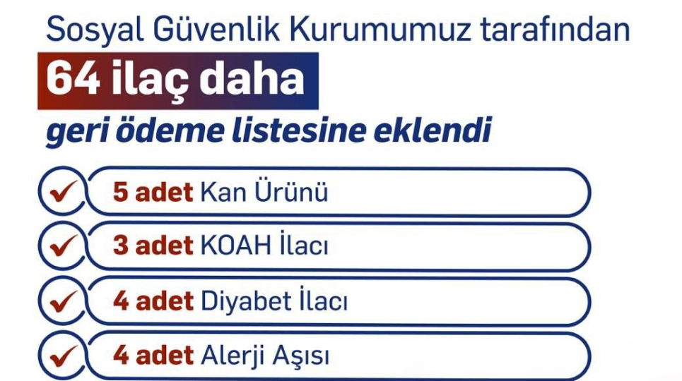 “Sosyal Güvenlik Kurumumuz tarafından 64 ilacı daha geri ödeme listesine aldık. 5 adet kan ürünü, 3 adet KOAH ilacı, 4 adet diyabet ilacı, 4 adet alerji aşısı, 4 adet antibiyotik, 1 adet biyobenzer göz içi uygulanan ilaç başta olmak üzere 51 adedi yerli üretim ilaçlar ile sağlıkta yerli ve milli üretimle güçlenmeye devam ediyoruz. Milletimize hayırlı uğurlu olsun.”