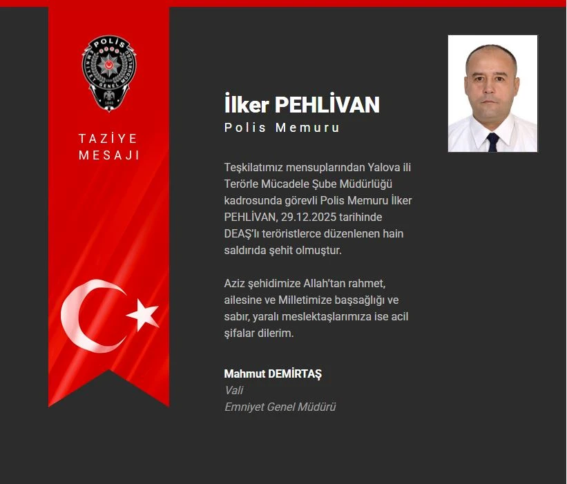 Emniyet Genel Müdürlüğü de yayımladığı taziye duyurusunda Pehlivan’ın, Yalova Terörle Mücadele Şube Müdürlüğü kadrosunda görevliyken 29.12.2025 tarihinde DEAŞ’lı teröristlerce düzenlenen saldırıda şehit olduğunu kayda geçirdi.