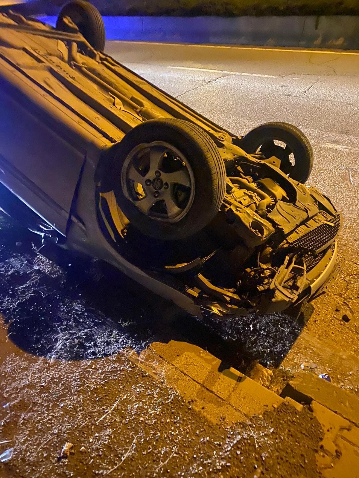Araç savrularak kaldırıma çarptı ve ters döndü.