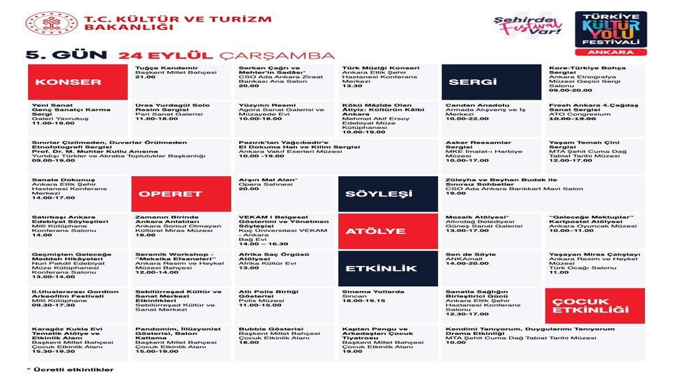 Türkiye Kültür Yolu Festivali, 24 Eylül Çarşamba günü beşinci gün etkinlikleriyle Ankaralıları bir kez daha kültür ve sanatın merkezinde buluşturuyor. Gün boyunca farklı mekanlarda gerçekleştirilecek konserler, sergiler, atölyeler, söyleşiler ve çocuk etkinlikleri hem yetişkinlere hem de gençlere hitap ediyor.