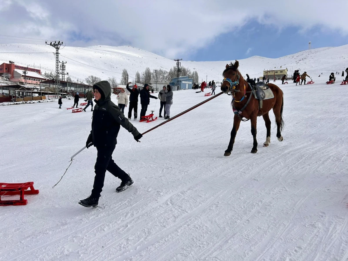Gün boyu yoğunluğun yaşandığı kayak merkezinde, ziyaretçiler sadece kayak takımlarıyla değil, kızaklarla da pistlerin tadını çıkardı. Bazı vatandaşlar ata binme etkinliklerine katılarak kar üzerinde farklı bir deneyim yaşarken, çocuklar kar topu oynayarak enerjilerini attı.