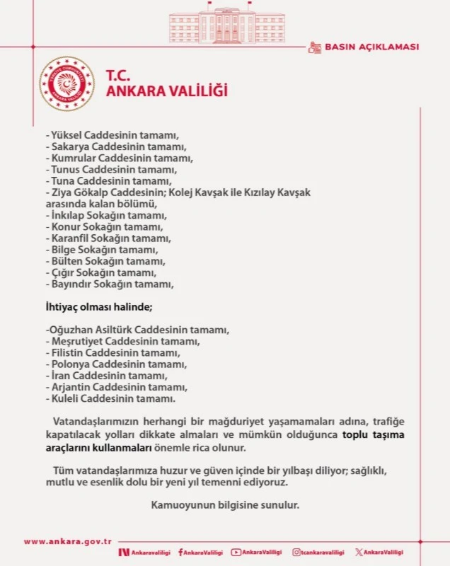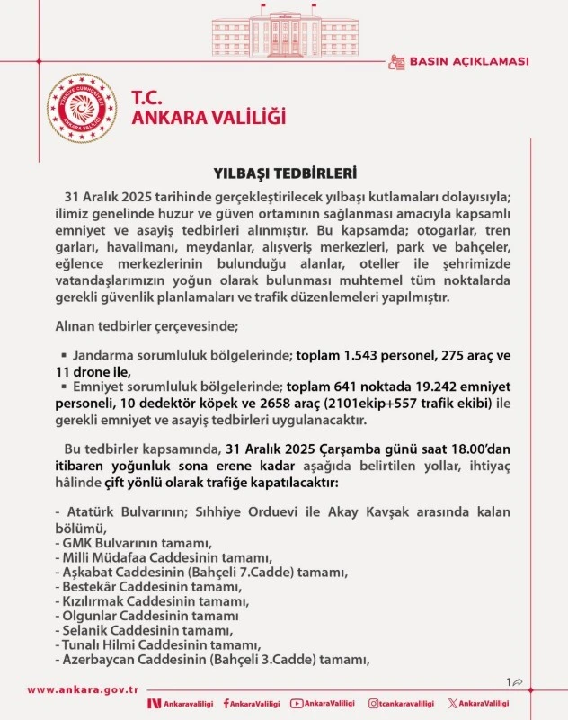 31 Aralık 2025 Çarşamba günü saat 18.00’den itibaren yoğunluk sona erene kadar Ankara’nın ana damarlarında trafik düzenlemesine gidilecek. İhtiyaç halinde çift yönlü kapatılacak yollar şunlar: