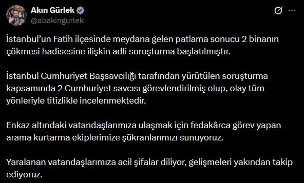 Adalet Bakanı Akın Gürlek, İstanbul’un Fatih ilçesinde meydana gelen ve iki binanın çökmesine neden olan feci patlamayla ilgili adli sürecin derhal başlatıldığını duyurdu. Sosyal medya hesabı üzerinden açıklama yapan Gürlek, olayın tüm boyutlarıyla incelendiğini vurguladı.