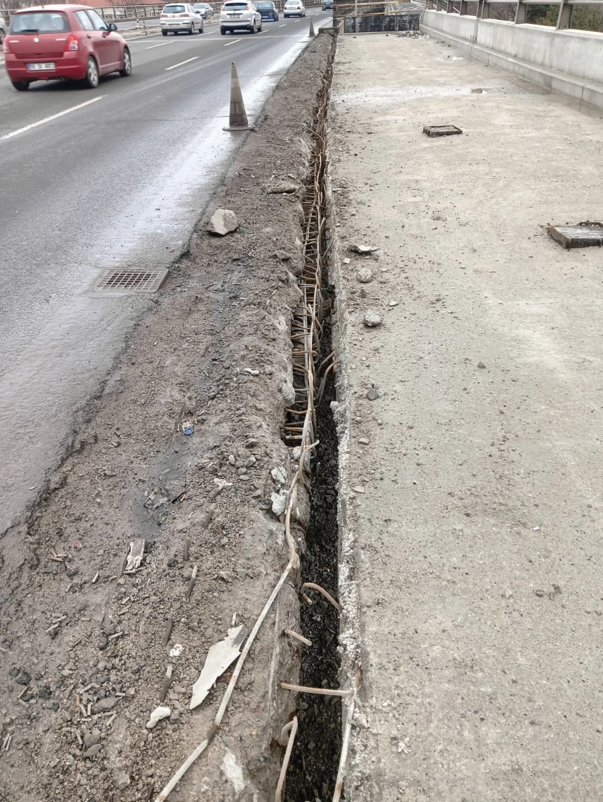 Daha önce mini bir iş makinesi ve tek bir işçinin çalışmasıyla gündeme gelen projede, gelinen nokta korkutucu boyutlara ulaştı. Köprünün yan kısımlarında yürütülen çalışmalar sonrası açık bırakılan alanlar, ana arterde seyreden sürücüler için büyük risk barındırıyor.
