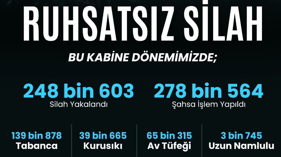 Yerlikaya, aynı paylaşımında bu kabine döneminde yürütülen çalışmaların genel bilançosunu da aktardı. Buna göre, bu dönemde düzenlenen operasyonlarda toplam 248.603 adet silah ele geçirildi; bunların arasında 139.878 ruhsatsız tabanca, 39.665 kurusıkıdan çevrilme tabanca, 65.315 ruhsatsız av tüfeği ve 3.745 uzun namlulu silah yer alıyor. Bu kapsamda 278.564 şüpheli hakkında işlem yapıldığı bildirildi.