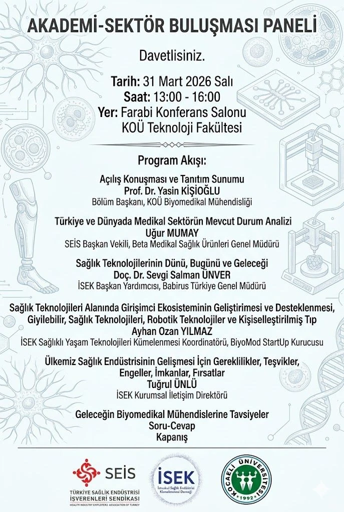 Ankara – Gazete Ankara Dijital Haber Portalı Haber Merkezi / Eğitim Haberleri- Kocaeli Üniversitesi Teknoloji Fakültesi ev sahipliğinde düzenlenecek olan “Akademi-Sektör Buluşması Paneli”, sağlık teknolojileri alanında akademi ile sektörün stratejik iş birliğini güçlendirmeyi hedefliyor. 31 Mart 2026 Salı günü saat 13.00-16.00 arasında Farabi Konferans Salonu’nda gerçekleştirilecek etkinlik, alanında uzman isimleri ve geleceğin mühendis adaylarını bir araya getirecek.