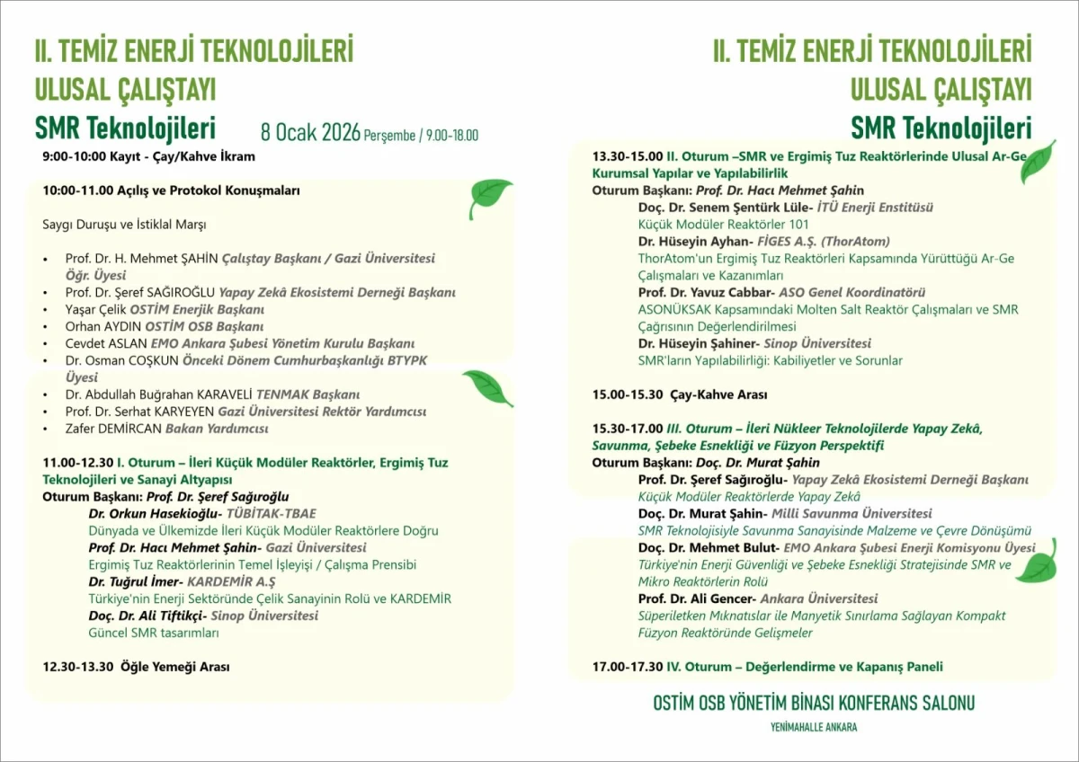 Gazi Üniversitesi ve Gazi Üniversitesi Enerji Sistemleri Topluluğu koordinasyonunda; OSTİM OSB, OSTİM Enerjik Kümesi, OSTİM Teknik Üniversitesi–ETAUM, Yapay Zekâ Ekosistemi Derneği ve TMMOB Elektrik Mühendisleri Odası Ankara Şubesi destekleriyle düzenlenen II. Temiz Enerji Teknolojileri Ulusal Çalıştayı – SMR Teknolojileri, 8 Ocak 2026’da Ankara OSTİM’de; küçük modüler reaktörlerden (SMR) erimiş tuz reaktörlerine, yapay zekâdan şebeke esnekliğine ve füzyon perspektifine uzanan çok disiplinli başlıklarla bilim–sanayi–kamu paydaşlarını aynı zeminde buluşturacak.