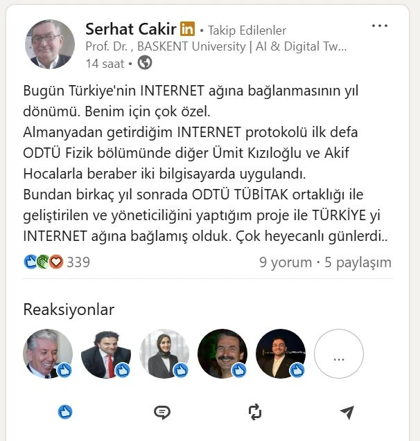 “Bugün Türkiye’nin internet ağına bağlanmasının yıl dönümü. Benim için çok özel. Almanya’dan getirdiğim internet protokolü ilk defa ODTÜ Fizik Bölümü’nde uygulandı. Ümit Kızıloğlu ve Akif hocalarla birlikte iki bilgisayarda denedik. Bundan birkaç yıl sonrasında ODTÜ TÜBİTAK ortaklığı ile geliştirdiğimiz ve yöneticiliğini yaptığım proje ile Türkiye’yi internet ağına bağlamış olduk. Çok heyecanlı günlerdi.”