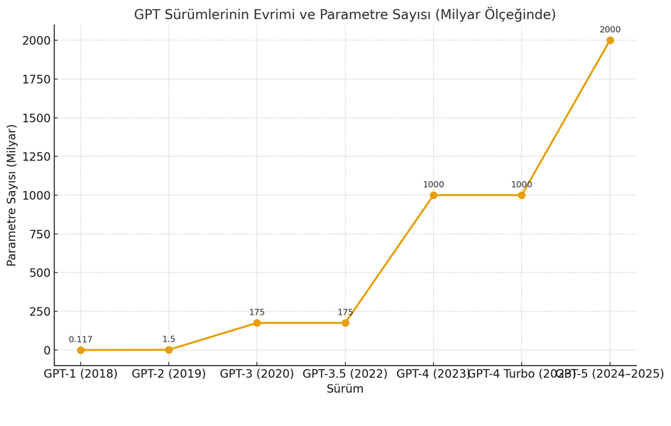 Özellikle 2018 yılında tanıtılan GPT-1, yalnızca 117 milyon parametreye sahipti ve dil üretiminde sınırlı bir başarı sunabiliyordu. Ancak birkaç yıl içinde bu sayı milyarları, ardından trilyonları buldu. Bu yalnızca teknik bir ilerleme değil; aynı zamanda yapay zekânın insana yakın diyalog, yaratıcılık ve akıl yürütme kapasitelerinde de devrim anlamına geliyordu.