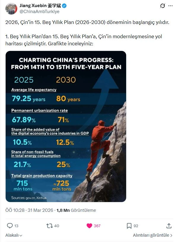 Çin’in 15. Beş Yıllık Planı, yalnızca bir ekonomik program değil; aynı zamanda ülkenin küresel güç olma yolundaki stratejik vizyonunun yeni bir aşamasıdır. Jiang Xuebin’in paylaştığı grafik ise bu uzun soluklu dönüşümün görsel bir özeti niteliğindedir.