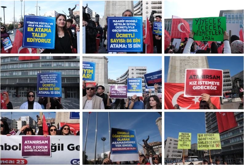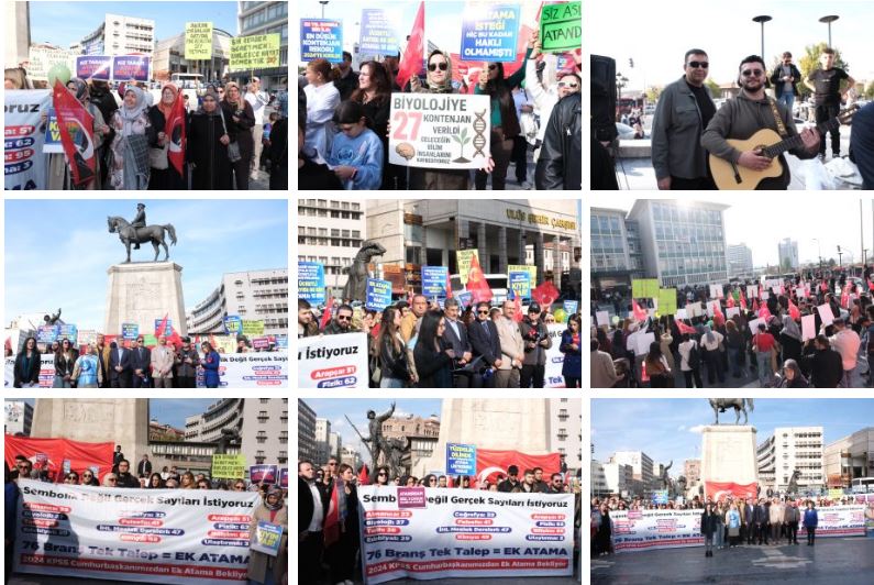 ANKARA – 2024 KPSS’de yüksek puan alarak derece yapmalarına rağmen kontenjan yetersizliği nedeniyle ataması gerçekleşmeyen öğretmenler, 24 Kasım Öğretmenler Günü öncesi Ankara Ulus Meydanı’nda bir araya gelerek ek atama talebinde bulundu. Öğretmenlerin eylemine Türk Eğitim-Sen Genel Başkanı Talip Geylan, Genel Başkan Yardımcıları Selahattin Dolgun ve Erhan Bayram ile çok sayıda sendika mensubu da destek verdi.