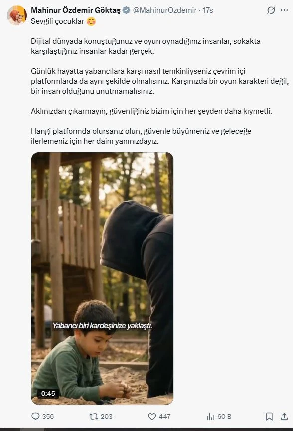 Ankara – Gazete Ankara Dijital Haber Portalı Haber Merkezi / Eğitim Haberleri – Aile ve Sosyal Hizmetler Bakanı Mahinur Özdemir Göktaş, sosyal medya hesabından yaptığı paylaşımda çocukların dijital dünyada güvenliğini merkeze alan önemli mesajlar verdi. Bakan Göktaş, özellikle çevrim içi oyunlar ve sosyal medya platformlarında çocukların karşılaştığı kişilerin gerçek insanlar olduğuna dikkat çekerek dijital güvenlik konusunda bilinçli olunması gerektiğini ifade etti.
