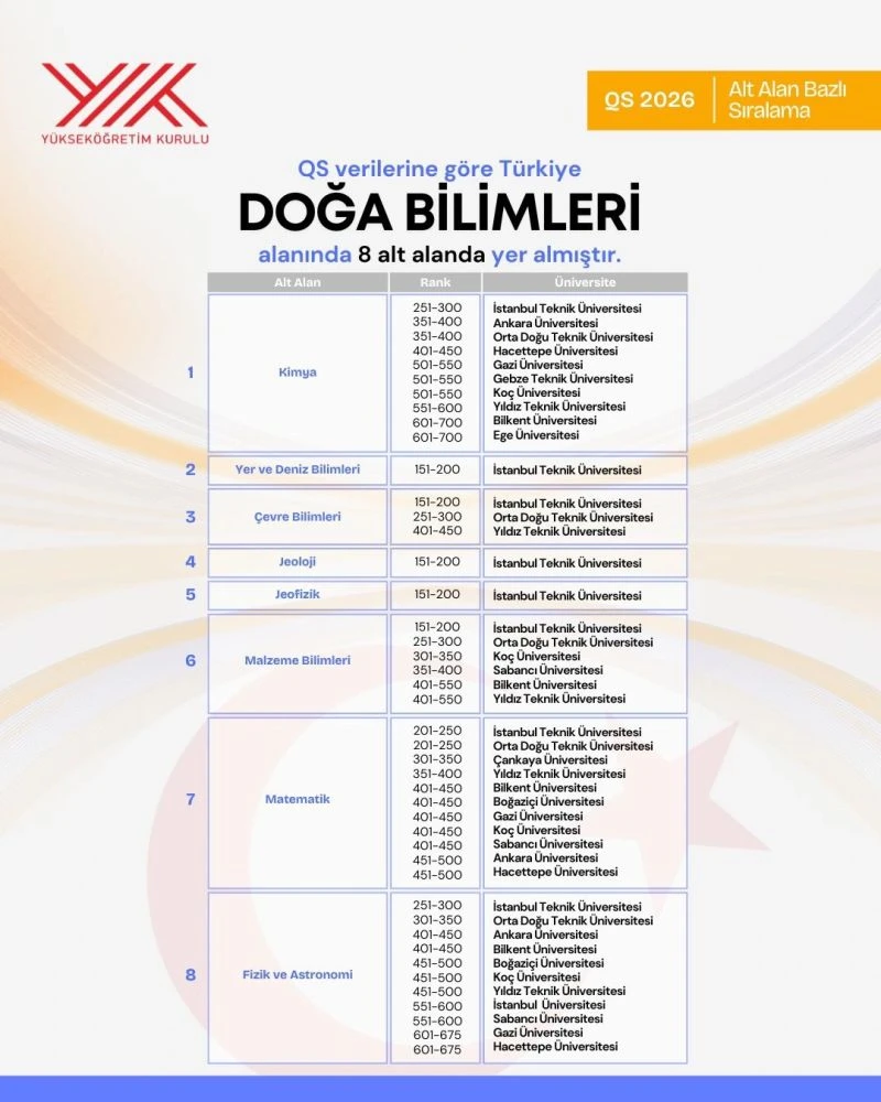 “Uluslararası QS verilerine göre Türkiye doğa bilimlerinde 8 dalda listede yer almıştır. Gazi Üniversitesi Fen Fakültemiz, farklı disiplinlerde dünya ve Türkiye sıralamalarında önemli bir konum elde etmiştir. Bu başarıyı tüm akademik kadromuzla birlikte paylaşıyoruz.”
