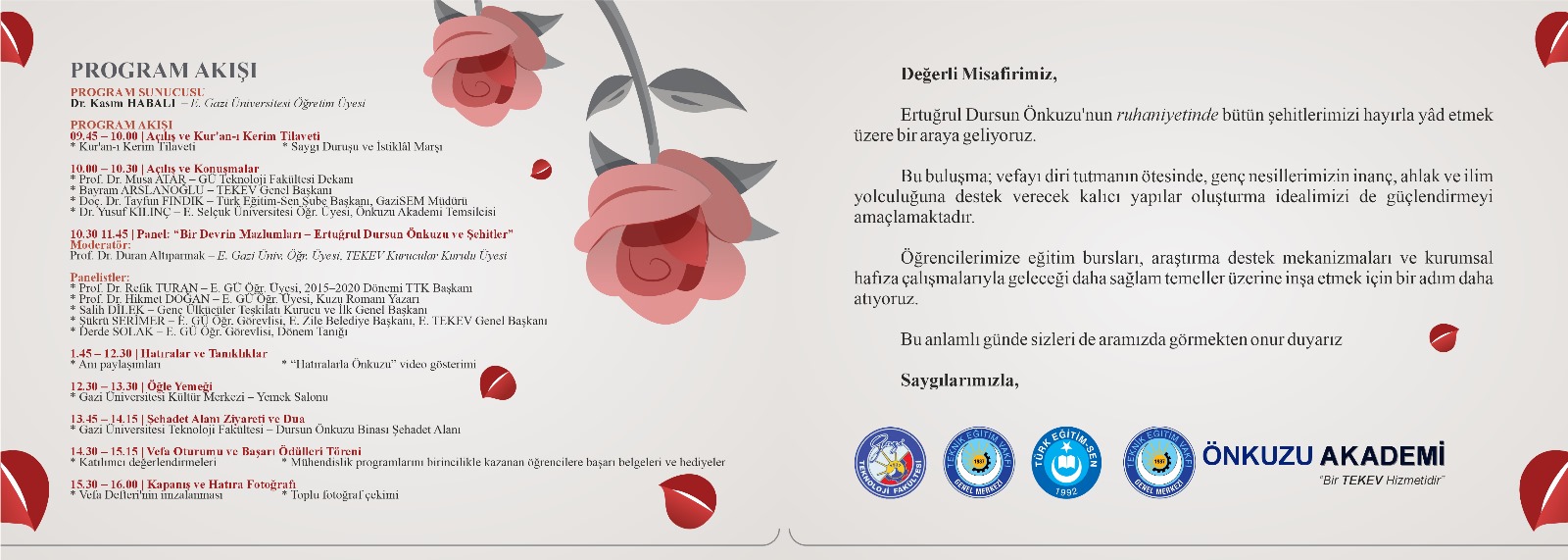 Gazi Üniversitesi Teknoloji Fakültesi, Teknik Eğitim Vakfı, Türk Eğitim-Sen ve Önkuzu Akademi iş birliğiyle, Ertuğrul Dursun Önkuzu’nun şehadetinin 55. yılında kapsamlı bir vefa programı düzenliyor. Panel, hatıralar, dua ve genç mühendislere başarı ödülleri töreniyle dolu program 27 Kasım 2025’te gerçekleştirilecek.