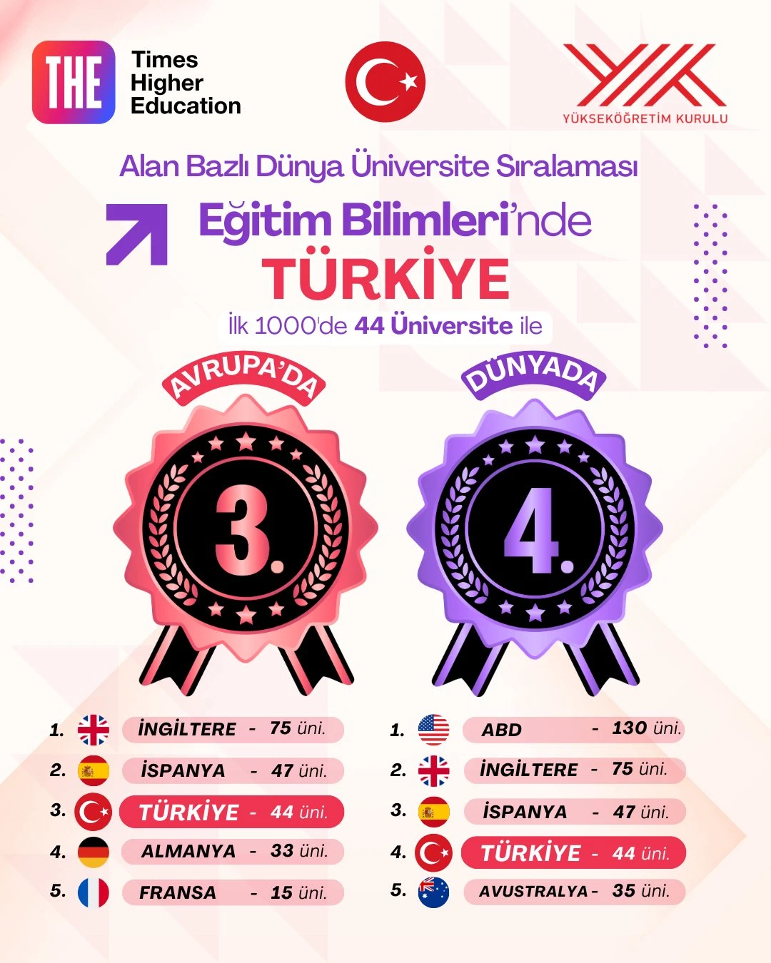 Times Higher Education (THE) tarafından açıklanan 2026 Alan Bazlı Dünya Üniversiteleri Sıralamaları’na göre Türkiye, Eğitim Bilimleri alanında ilk 1000’de yer alan 44 üniversiteyle Avrupa’da 3’üncü, dünyada 4’üncü sıraya yükseldi. Orta Doğu Teknik Üniversitesi (ODTÜ) ise bu alanda dünya ilk 100’üne giren tek Türk üniversitesi oldu.