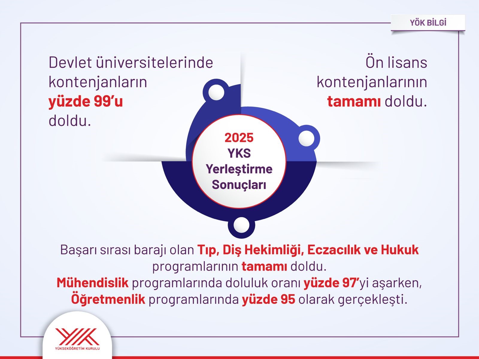 ÖSYM, 2025-YKS yerleştirme sonuçlarını açıkladı. Devlet üniversitelerinde kontenjanların yüzde 99’u dolarken, ön lisans programlarında doluluk yüzde 100’e ulaştı. YÖK Başkanı Prof. Dr. Erol Özvar, “Üniversitelerimizi yapay zekâ ve dijital teknolojilerde küresel dönüşümün merkezine taşıyacağız” dedi.