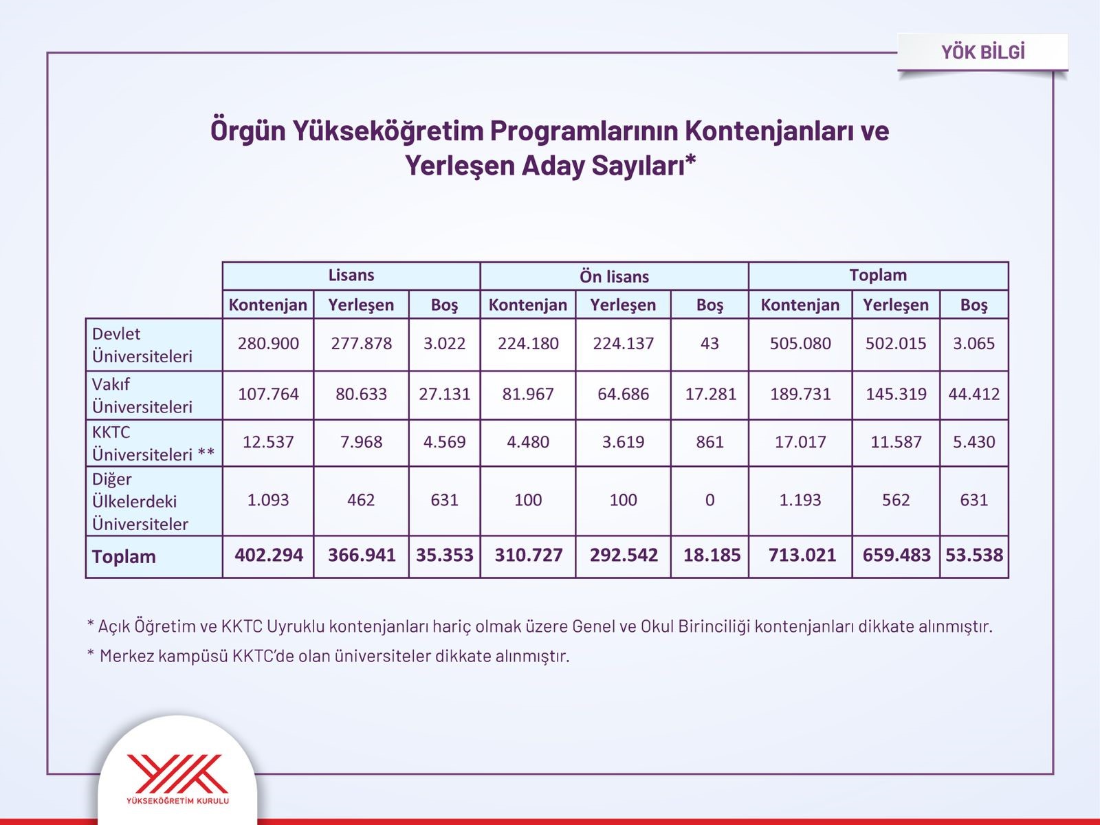 - Devlet ve vakıf üniversiteleri toplamında 665 bin 54 öğrenci örgün lisans ve ön lisans programlarına yerleşti.