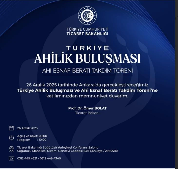 Ticaret Bakanlığı, 26 Aralık 2025’te Ankara Söğütözü Yerleşkesi’nde “Türkiye Ahilik Buluşması ve Ahi Esnaf Beratı Takdim Töreni” düzenleyecek; beratlar Ticaret Bakanı Prof. Dr. Ömer Bolat tarafından verilecek.