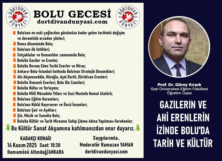 Aynı zamanda Gazete Ankara Dijital Haber Portalı’nın köşe yazarları arasında bulunan Prof. Dr. Kırpık, etkinlikte Bolu’nun kültürel mirası ve Anadolu yerel kültürlerinin ortak hafızadaki önemi üzerine kısa bir değerlendirme yapacak.