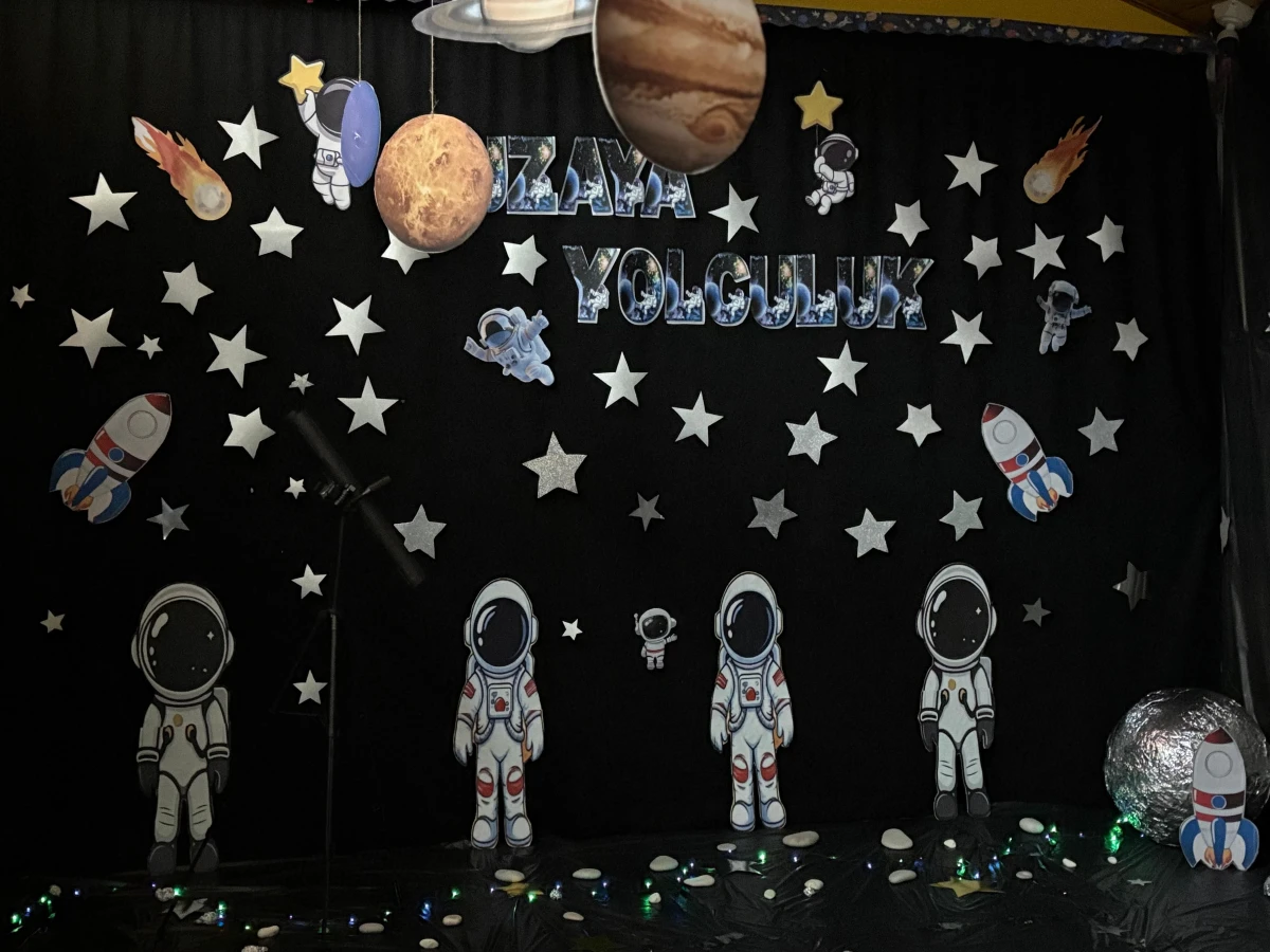 Gezegenler ve yıldızlarla süslenen sınıfta astronot kostümleri giyen minikler, hem eğlendi hem de uzay kavramıyla ilk kez tanışma fırsatı buldu.