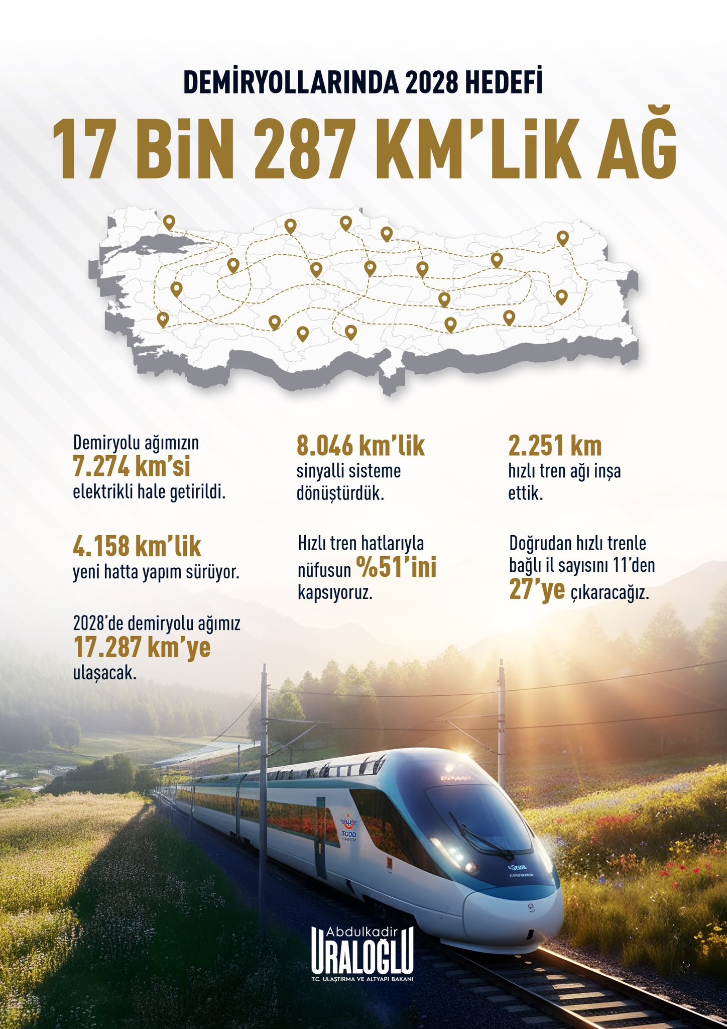 Uraloğlu, Türkiye’nin demiryolu ulaşımında modernizasyon ve hızlı tren yatırımlarını kararlılıkla sürdüreceğini vurgularken, 2028 yılına kadar demiryolu ağının daha da genişleyeceğini ifade etti.