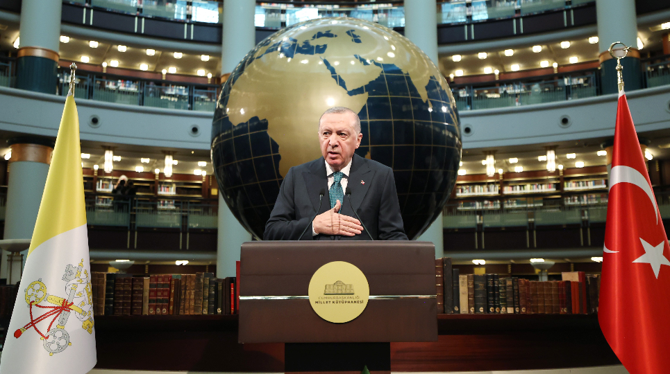 Cumhurbaşkanı Recep Tayyip Erdoğan, Vatikan Devlet Başkanı Papa 14. Leo ile görüşmesinin ardından, Cumhurbaşkanlığı Millet Kütüphanesi Cihannüma Salonu’nda davetlilere hitap etti. Erdoğan, "İnsanlık ailesi olarak Filistin halkına en büyük borcumuz adalettir, bu borcu ödemenin yolu ise 1967 sınırları temelinde iki devletli çözüm vizyonunu bir an önce hayata geçirmektir" dedi.