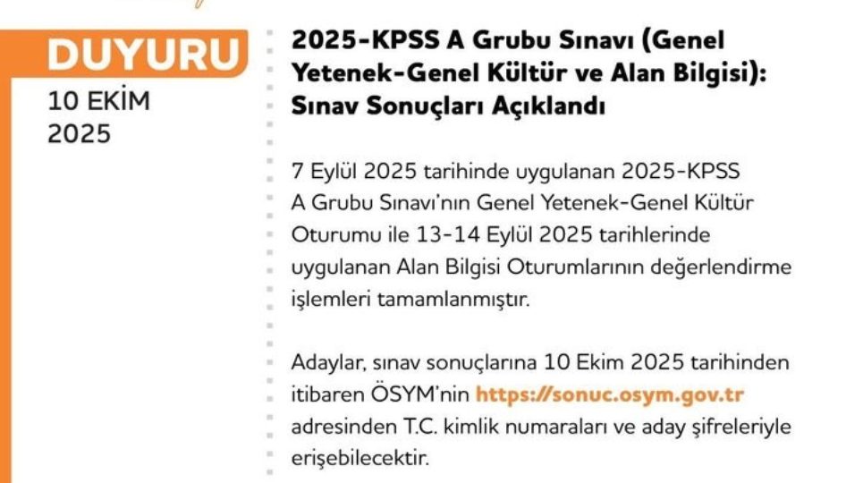 ÖSYM tarafından yapılan yazılı açıklamada, “2025-KPSS A Grubu Sınavı (Genel Yetenek-Genel Kültür ve Alan Bilgisi) sonuçları açıklandı. 7 Eylül 2025 tarihinde yapılan Genel Yetenek-Genel Kültür oturumu ile 13-14 Eylül 2025 tarihlerinde yapılan Alan Bilgisi oturumlarının değerlendirme işlemleri tamamlanmıştır” denildi.