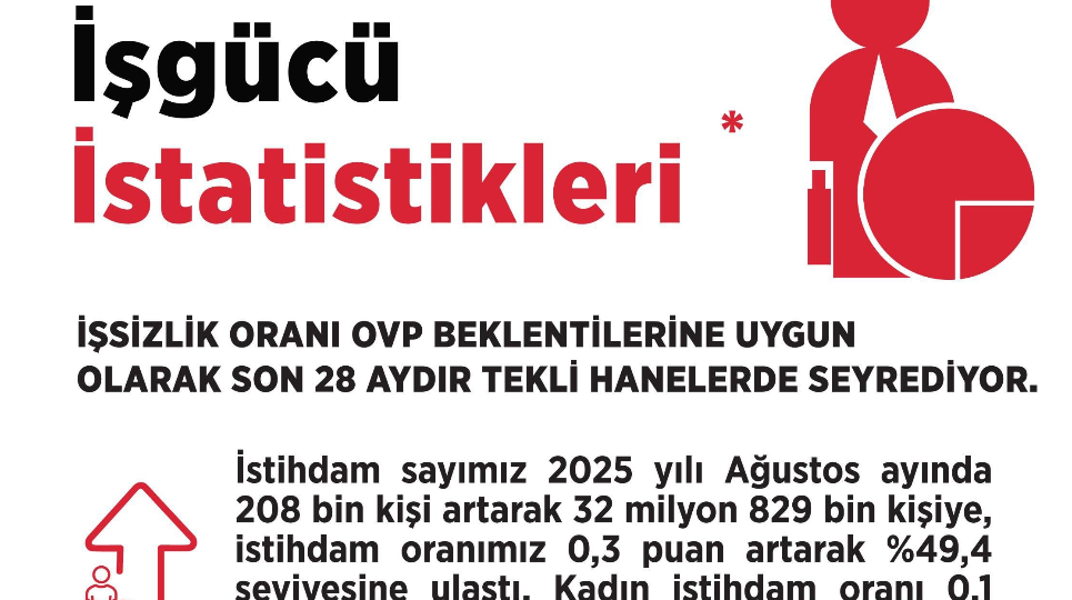 Bakan Işıkhan, Ağustos ayında istihdamın bir önceki aya göre 208 bin kişi artarak 32 milyon 829 bin kişiye ulaştığını, istihdam oranının ise 0,3 puan artışla yüzde 49,4 seviyesine çıktığını açıkladı. İşgücü piyasasında da olumlu seyrin devam ettiğini belirten Işıkhan, “İşgücümüz aynı dönemde 376 bin kişi artarak 35 milyon 873 bin kişiye yükseldi. İşgücüne katılma oranı ise 0,6 puan artışla yüzde 54 olarak gerçekleşti” ifadelerini kullandı.