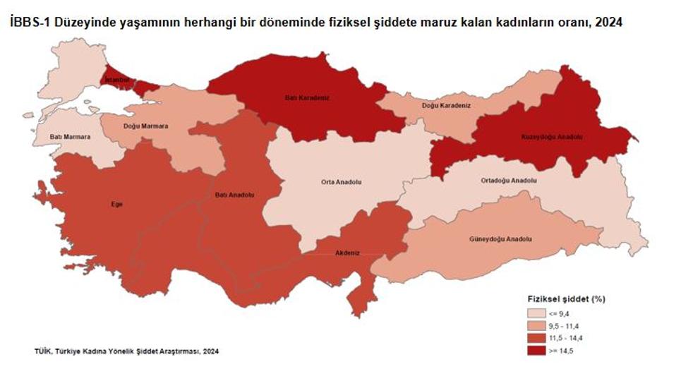 Fiziksel şiddet ise bölgesel olarak en yoğun Kuzeydoğu Anadolu’da (%25,9), en düşük Ortadoğu Anadolu’da (%8,8) tespit edildi.