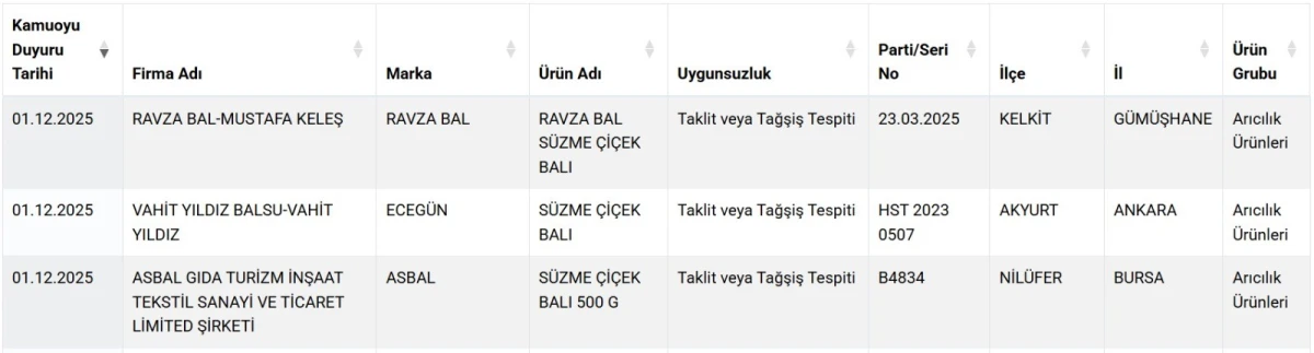 Tarım ve Orman Bakanlığı, tüketicinin sağlıklı ve güvenilir gıdaya ulaşımını sağlamak amacıyla yayımladığı ‘Taklit veya Tağşiş Yapılan Gıdalar’ listesine, arıcılık ürünleri grubundan 3 firma ve ürünü daha ekledi. Söz konusu firmalara ait süzme bal ürünlerinde taklit veya tağşiş (ürün içeriğinde hileli değişiklik) tespit edildi.