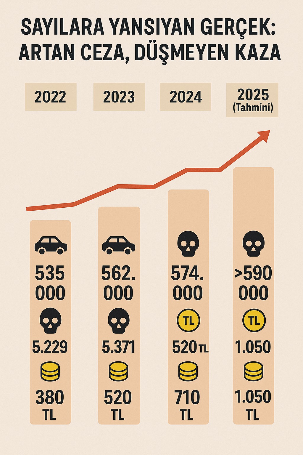Bu verilerden açıkça görüldüğü üzere, cezaların ciddi oranda artırıldığı yıllarda trafik kazaları azalmamış, aksine artış eğilimi göstermiştir.