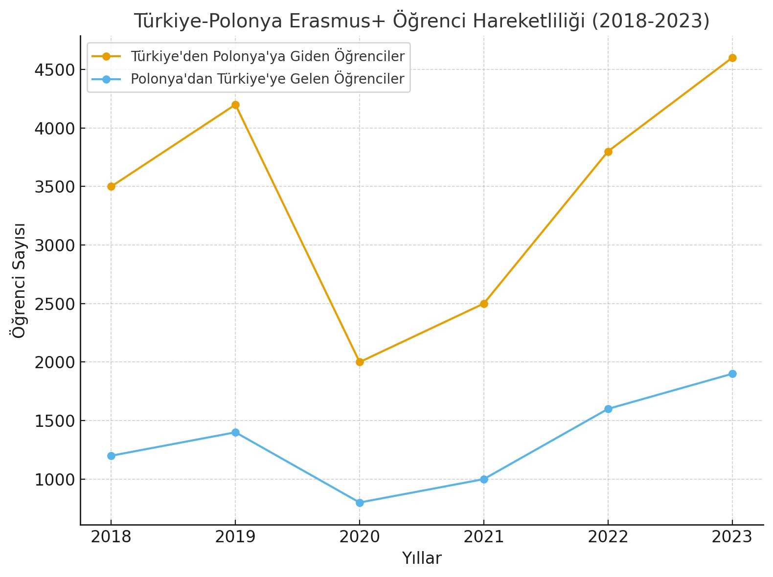 Şekil 1.’deki grafik verileri de göstermektedir ki, 2018–2023 yılları arasında Erasmus+ öğrenci hareketliliğinde Türkiye’den Polonya’ya giden öğrenci sayısında düzenli bir artış gözlenirken, Polonya’dan Türkiye’ye gelen öğrenci sayısı sınırlı olmakla birlikte yükseliş eğilimindedir. Bu tablo, iş birliği protokollerinin gelecekte öğrenci hareketliliğini daha da dengeleyici bir etki yapacağını ortaya koymaktadır.
