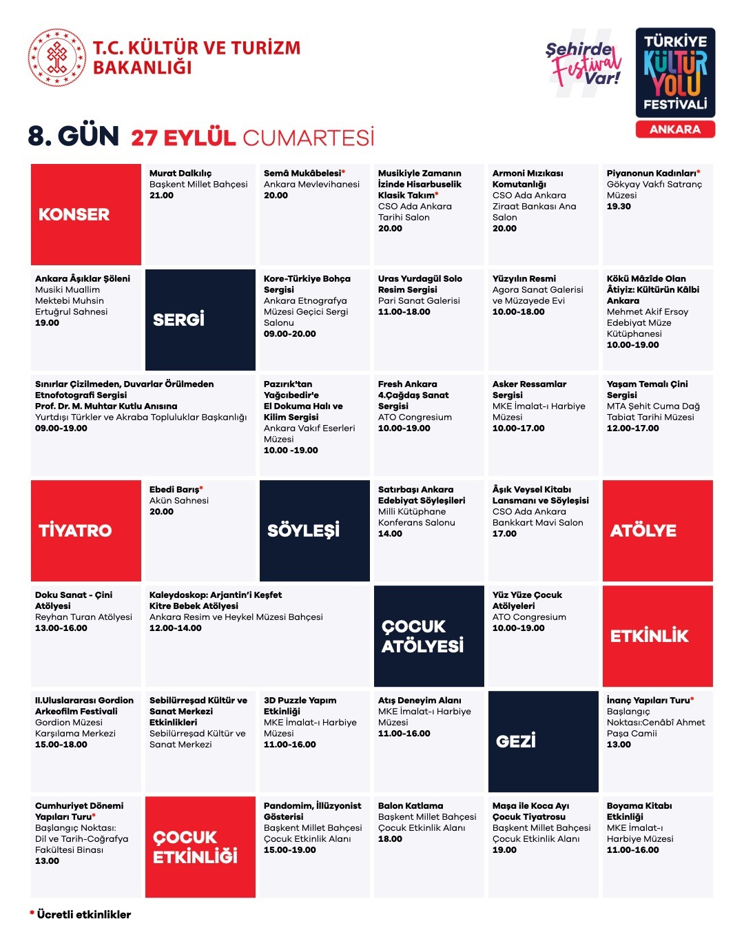 Türkiye Kültür Yolu Festivali, Ankara’daki serüvenini 28 Eylül Pazar günü büyük bir finalle taçlandırıyor. Sekiz gün boyunca şehrin dört bir yanında sanatın farklı disiplinlerini bir araya getiren festival, son gününde de dopdolu bir programla sanatseverlere unutulmaz anlar yaşatacak.