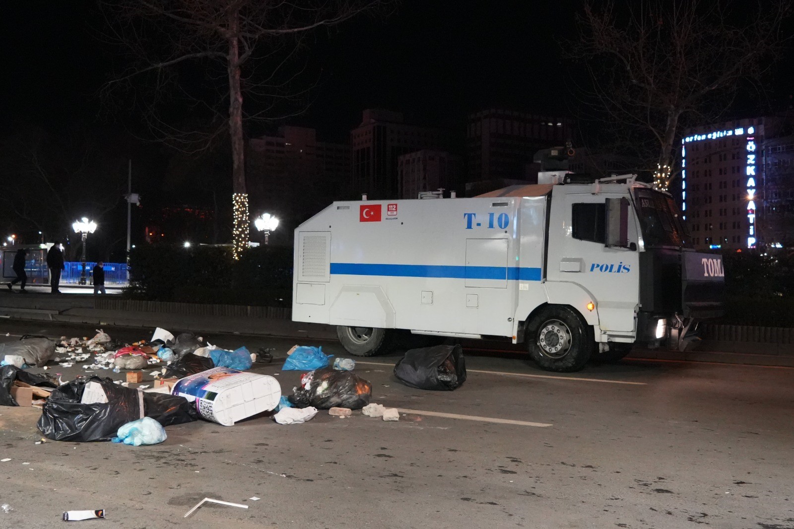 Tazyikli su ve biber gazı kullanılarak kalabalığın dağılması sağlanmaya çalışıldı. Müdahale sonrası dağılan grup, Meşrutiyet Caddesi üzerinde yeniden toplandı. Burada yüzlerini maske ile gizleyen bazı kişilerin çevredeki iş yerlerinden aldıkları masa ve sandalyeleri polise fırlattığı gözlendi.