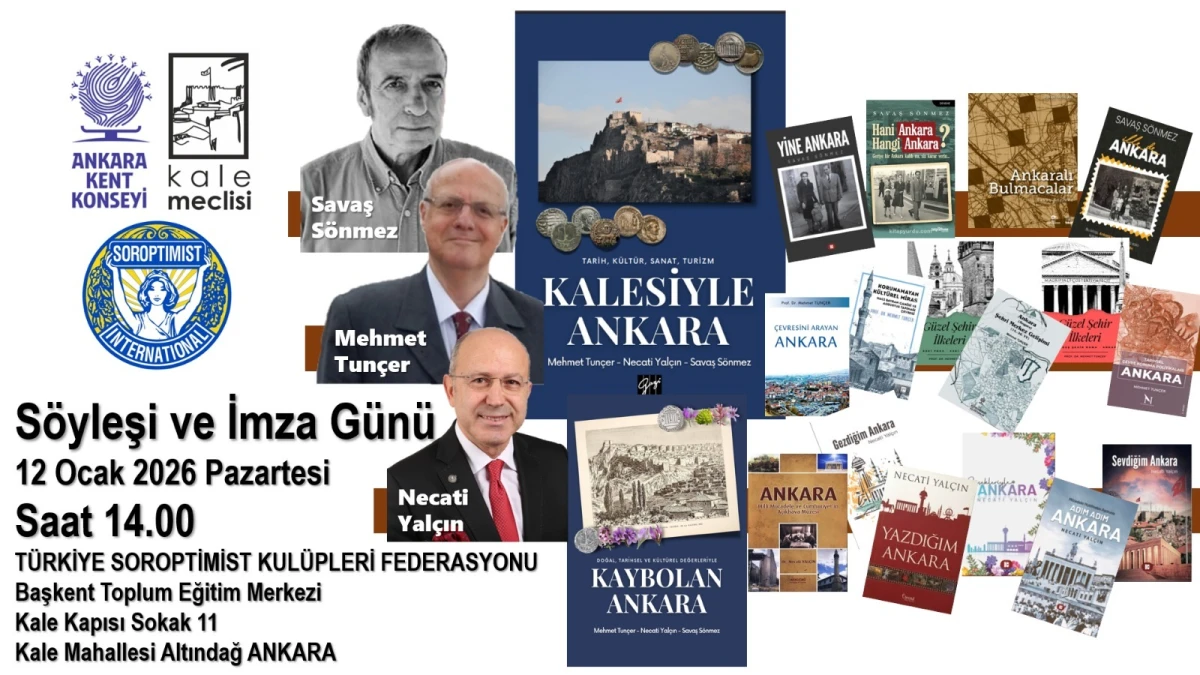 ANKARA- Gazete Ankara DHP Haber Merkezi- Ankara’nın tarihsel kimliği, kültürel mirası ve kent belleği üzerine çalışan isimler 12 Ocak 2026 Pazartesi günü Altındağ’da düzenlenecek özel bir söyleşi ve imza etkinliğinde bir araya geliyor. Paylaşılan bilgilere göre; “Söyleşi ve İmza Günü” başlıklı etkinlikte Ankara’nın geçmişi ile bugünü arasındaki köprü, özellikle Ankara Kalesi merkezli bir okuma üzerinden ele alınacak.