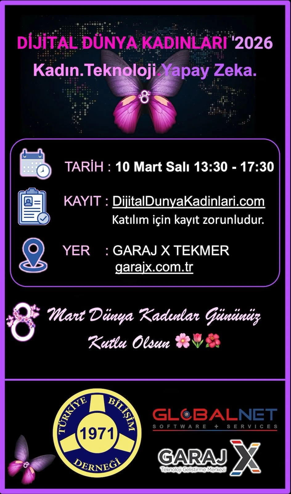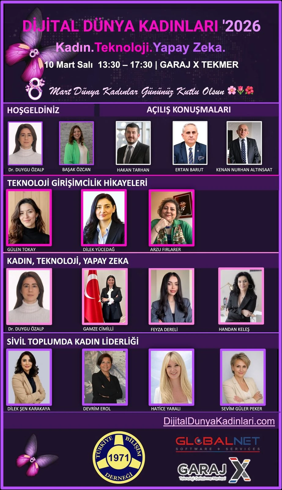 Türkiye Bilişim Derneği’nin katkılarıyla düzenlenen etkinlik, 10 Mart Salı günü 13.30–17.30 saatleri arasında Garaj X Teknoloji Geliştirme Merkezi (TEKMER) ev sahipliğinde gerçekleştirilecek. Programda teknoloji girişimcileri, akademisyenler, kamu temsilcileri ve sivil toplum liderleri bir araya gelerek kadınların dijital dünyadaki etkisini farklı boyutlarıyla değerlendirecek.