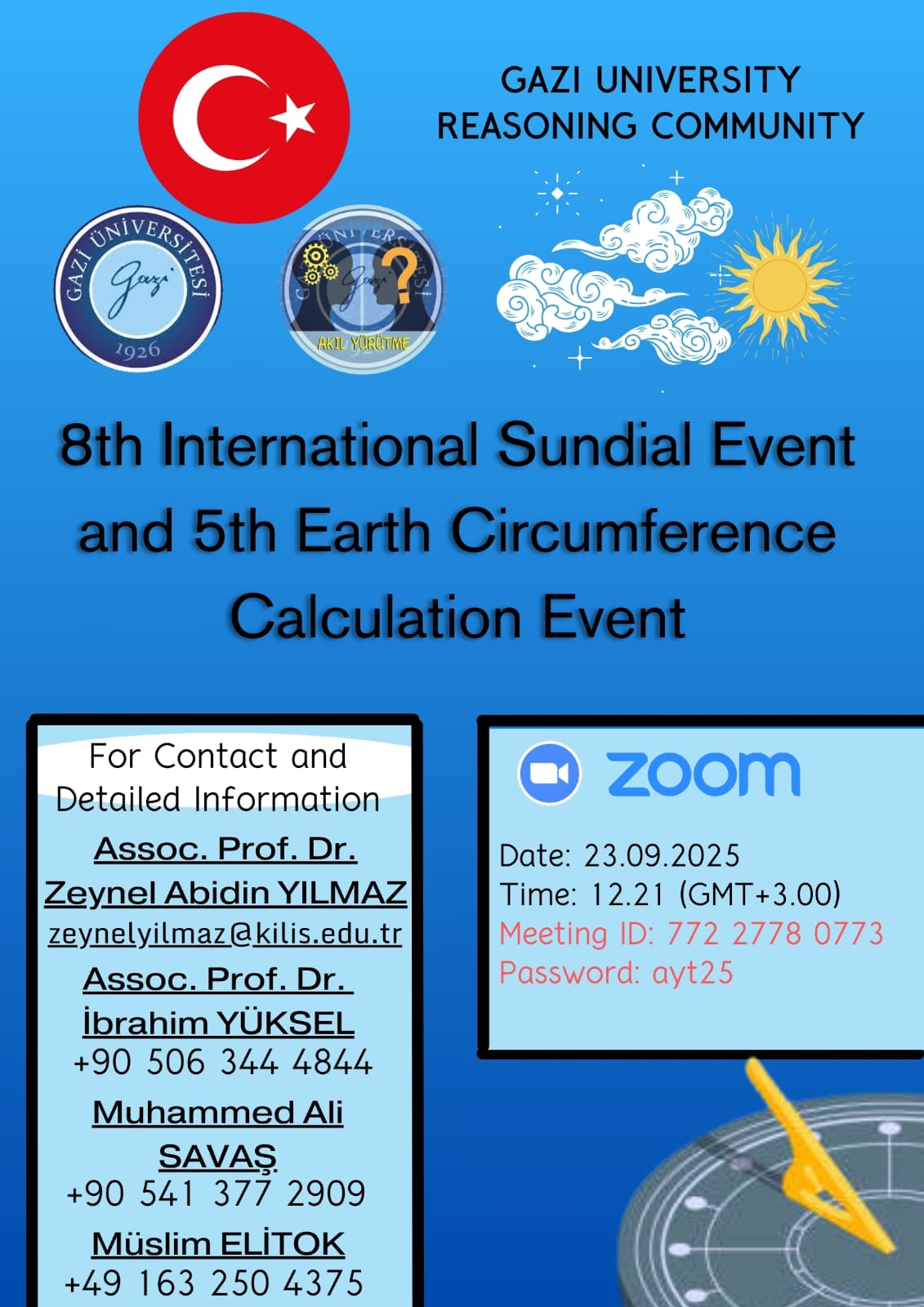 ANKARA – Gazi Üniversitesi Akıl Yürütme Topluluğu öncülüğünde yürütülen hazırlıklar tamamlanmak üzere. 23 Eylül 2025’te hem Gazi Üniversitesi Rektörlük Yerleşkesi’nde hem de dünyanın farklı ülkelerinde eş zamanlı olarak düzenlenecek olan “8. Uluslararası Güneş Saati” ve “5. Yerküre’nin Çevresini Hesaplama Etkinliği”, bilimsel düşünceyi pratiğe dönüştüren örnek bir platform oluşturuyor.