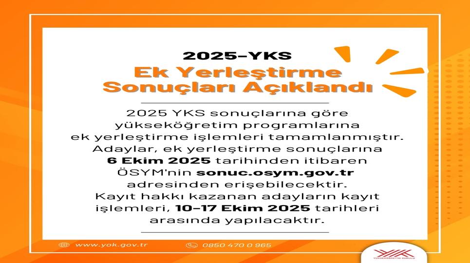 ÖSYM, 2025-YKS ek yerleştirme sonuçlarını erişime açtı. Kayıt hakkı kazanan adaylar 10-17 Ekim 2025 tarihleri arasında üniversitelere kayıt yaptırabilecek.