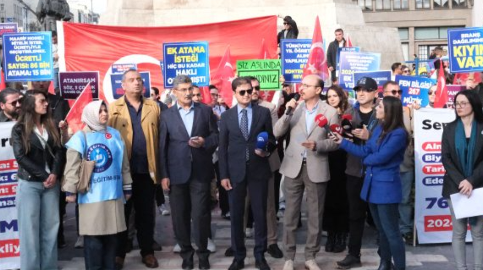 Eyleme katılan öğretmen adayları, “En düşük kontenjan 2024’te kırıldı”, “Branş dağılımında kıyım var”, “Ek atama isteği bu kadar ihtiyaç olmamıştı”, “Siz aslında atandınız”, “Atanırsam kız istemeye gideceğiz” gibi pankartlarla öğretmen ihtiyacına dikkat çekti.