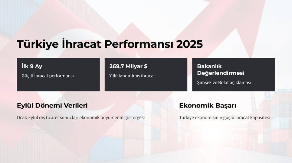 Türkiye ekonomisi, 2025 yılının ilk dokuz ayında ihracat performansıyla dikkat çekti. Hazine ve Maliye Bakanı Mehmet Şimşek ile Ticaret Bakanı Ömer Bolat, Eylül ayı ve Ocak-Eylül dönemi dış ticaret verilerini değerlendirerek yıllıklandırılmış ihracatın 269,7 milyar dolara ulaştığını açıkladı.