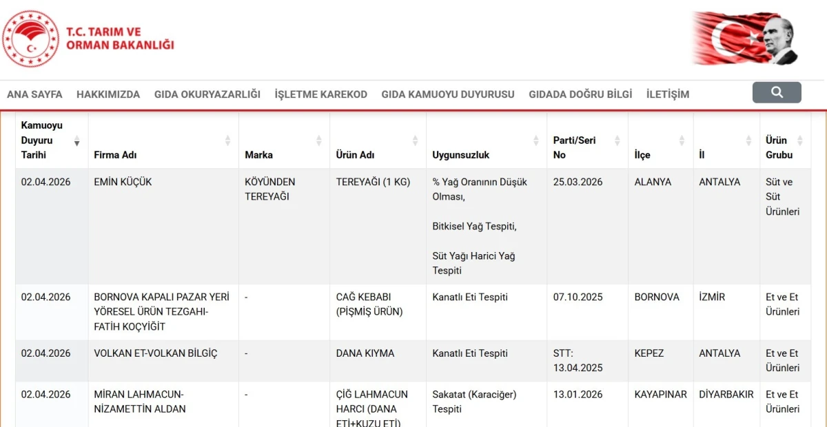 Tarım ve Orman Bakanlığı, halk sağlığını korumak ve gıda güvenilirliğini sağlamak amacıyla düzenli olarak yayımladığı "Taklit veya Tağşiş Yapılan Gıdalar" listesini 2 Nisan tarihi itibarıyla güncelledi. Yeni listede süt ürünlerinden et ürünlerine, bitkisel yağlardan takviye edici gıdalara kadar pek çok kategoride çok sayıda uygunsuzluk tespit edildi. Bakanlık, vatandaşların tükettiği ürünlerin içeriğiyle oynayan ve halkın sağlığını tehlikeye atan firmaları tek tek deşifre etti.