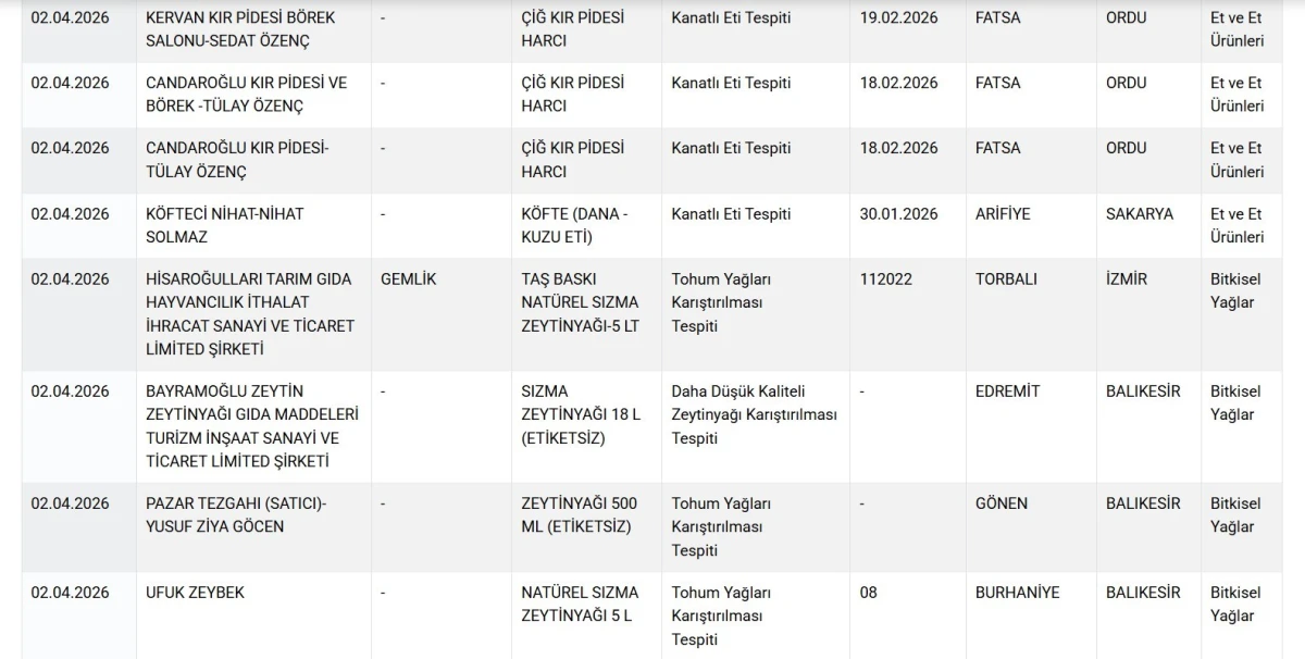 İstanbul Bağcılar’daki Tertip Et’in dana kıymasından taşlık ve kanatlı eti çıkarken, Kartal’daki Okyanus Lezzet firmasının pişmiş kasap köftesinde deri dokusu bulundu. İzmir’de ise Gürman Pide’nin lahmacun harcında kalp, Fatih Koçyiğit’in cağ kebabında kanatlı eti tespit edildi. Sakarya, Ordu ve Antalya’daki bazı işletmelerde de köfte ve kıyma gibi temel ürünlerde benzer şekilde kanatlı eti karışımları belgelendi.