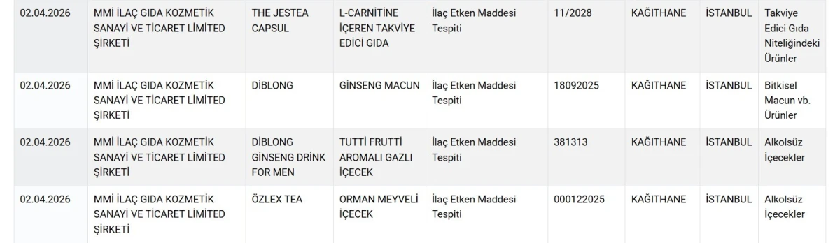Listenin en kritik bölümünü oluşturan "Sağlığı Tehlikeye Düşürecek Gıdalar" kısmında, özellikle bitkisel ve takviye edici olarak pazarlanan ürünlerdeki tehlike dikkat çekti. İstanbul Kağıthane merkezli MMİ İlaç Gıda Kozmetik Sanayi ve Ticaret Limited Şirketi tarafından piyasaya sürülen birçok üründe, içeriğinde bulunmaması gereken ve sadece doktor kontrolünde kullanılması gereken ilaç etken maddeleri tespit edildi. Uygunsuzluk bulunan ürünler şu şekilde sıralandı: