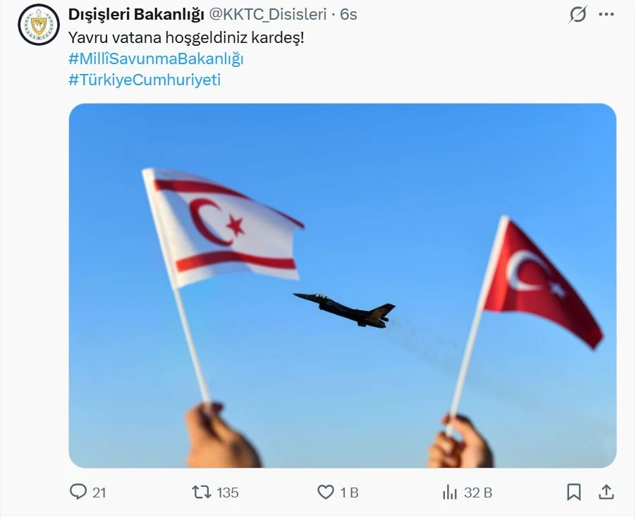 KKTC Dışişleri Bakanlığı sosyal medya hesabından yaptığı paylaşımda Türkiye’ye hitaben şu ifadeleri kullandı: