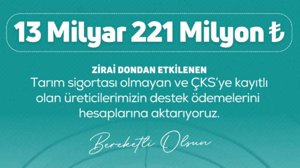“Zirai dondan etkilenen üreticilerimizin yanında olmayı sürdürüyoruz. Tarım sigortası bulunmayan ancak Çiftçi Kayıt Sistemi’ne (ÇKS) kayıtlı üreticilerimize ilk etapta 13 milyar 221 milyon lira destek ödemesi yapıyoruz. Üreticimizin emeğini koruyarak, tarımsal üretimde sürdürülebilirliği ve kırsal kalkınmayı güçlendirmeye devam ediyoruz.”