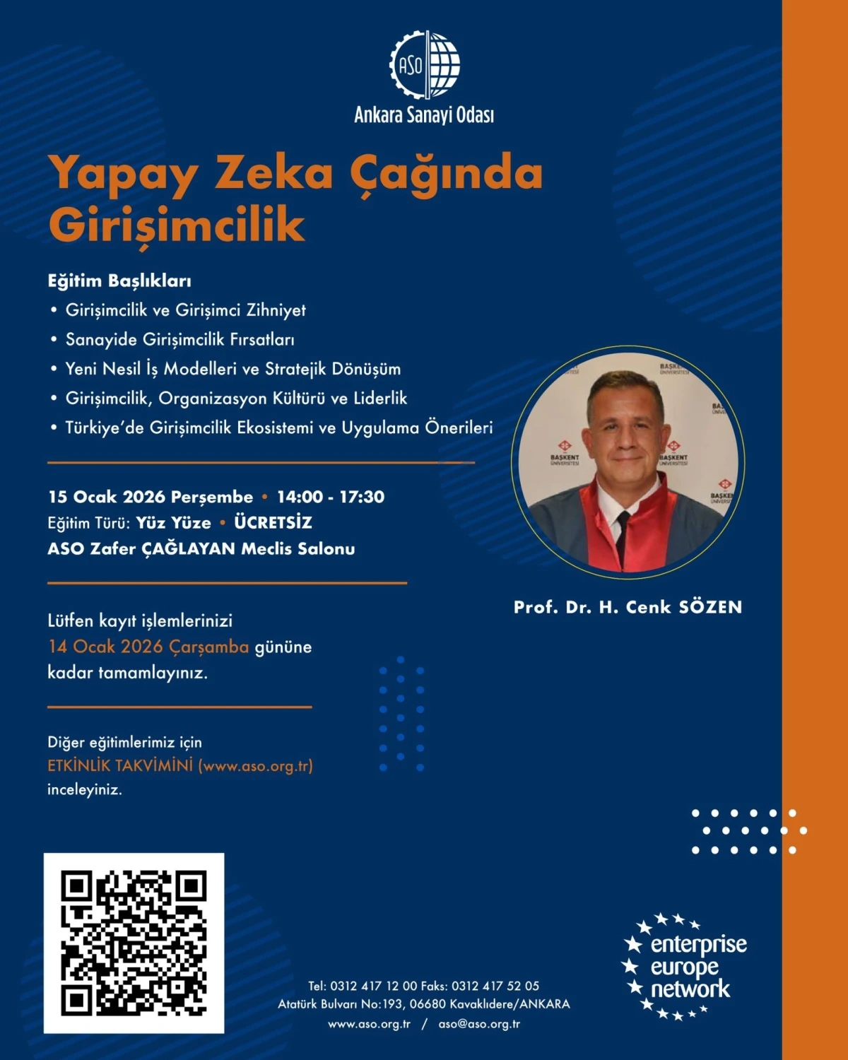 Ankara Sanayi Odası (ASO), üyelerine yönelik “Yapay Zeka Çağında Girişimcilik” başlıklı yüz yüze ve ücretsiz bir eğitim programı düzenliyor. Eğitim, 15 Ocak 2026 Perşembe günü 14.00–17.30 saatleri arasında ASO Zafer Çağlayan Meclis Salonu’nda gerçekleştirilecek. Programa Prof. Dr. H. Cenk Sözen konuşmacı olarak katılacak.