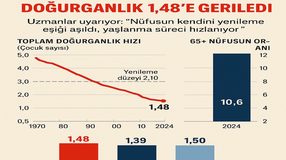 ANKARA (Gazete Ankara DHP Haber Merkezi)- Türkiye’nin demografik dengesi alarm veriyor. Türkiye İstatistik Kurumu (TÜİK) tarafından yayımlanan son verilere göre, 2024 yılında toplam doğurganlık hızı 1,48 olarak gerçekleşti. Bu oran, nüfusun kendini yenileyebilmesi için gerekli kabul edilen 2,10 seviyesinin oldukça altında bulunuyor. Uzmanlara göre bu tablo, Türkiye’nin “genç nüfus avantajını” hızla kaybettiğini ve toplumsal yaşlanma sürecinin geri döndürülemez bir eşiğe girdiğini gösteriyor.
